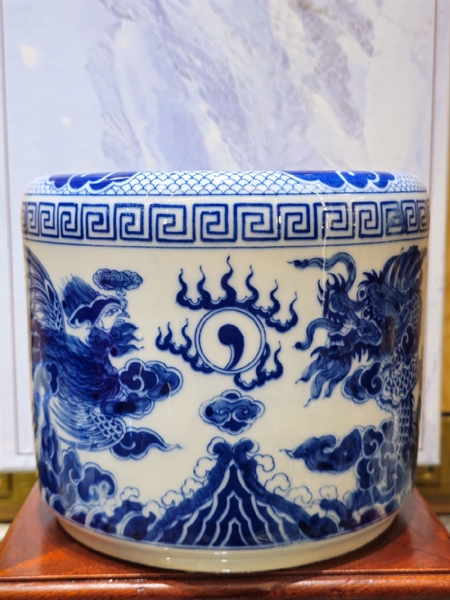 Họa tiết Rồng – Phượng men lam vẽ tay sống động, tượng trưng cho âm dương hòa hợp, thịnh vượng và bình an.