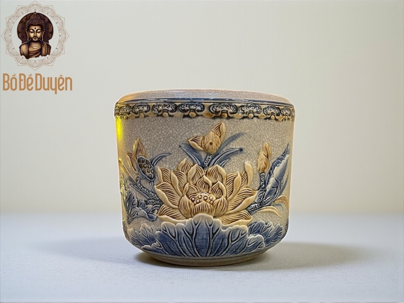 Họa tiết đắp nổi thủ công, từng cánh sen sống động, sắc nét, giữ màu bền đẹp theo thời gian.