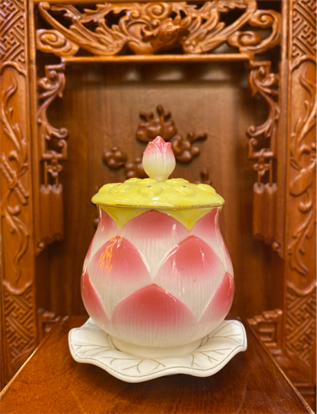 Nắp có hình nụ sen vàng – biểu tượng cho sự viên mãn và tâm thành dâng cúng.