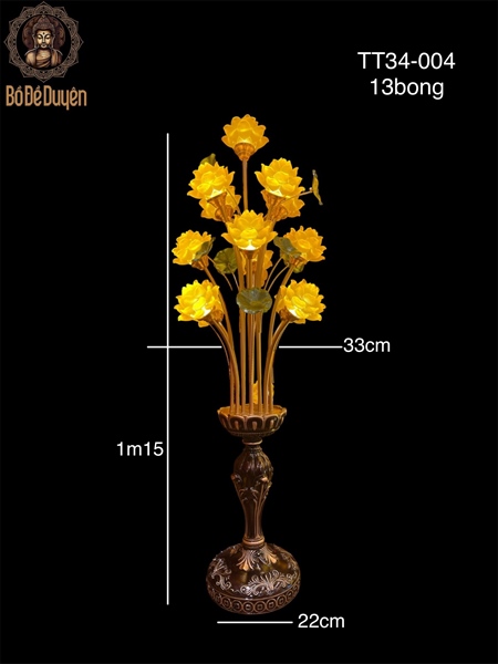 Hoa sen tượng trưng cho thanh tịnh – giác ngộ – trí tuệ. Đèn 13 bông mang ý nghĩa viên mãn – cát tường, giúp: