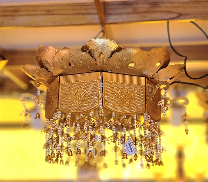 Tua hạt pha lê vàng ánh kim: Khi ánh sáng chiếu qua, các chuỗi hạt phản quang lung linh như Phật quang chiếu rọi, tạo nên không gian thanh tịnh – linh thiêng – trang trọng.