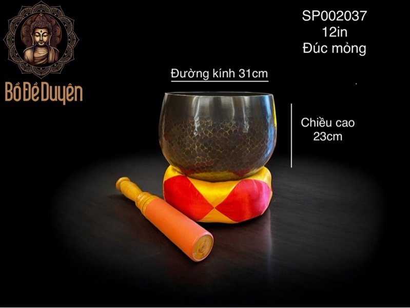 Chuông có đường kính 31cm, chiều cao 23cm, thân chuông chắc dày, cho âm thanh vang trầm, ngân dài, đều tiếng, không chói gắt. Phù hợp sử dụng tại gia đình, chùa chiền, đạo tràng và phòng thiền, đáp ứng nhu cầu tu tập lâu dài và bền vững.
