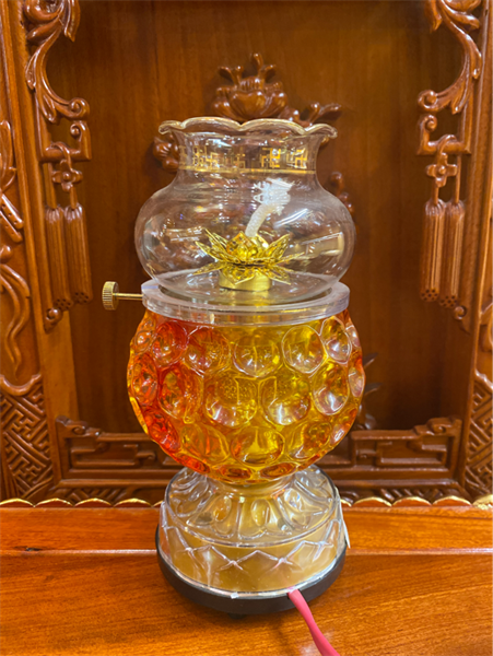 Đèn dầu tượng trưng cho trí tuệ – ánh sáng giác ngộ, soi đường tu tập. Đặt đèn dầu điện trên ban thờ mang ý nghĩa giữ cho không gian thờ luôn ấm áp, thanh tịnh, liên tục ánh sáng mà không lo tắt lửa hay nguy hiểm.