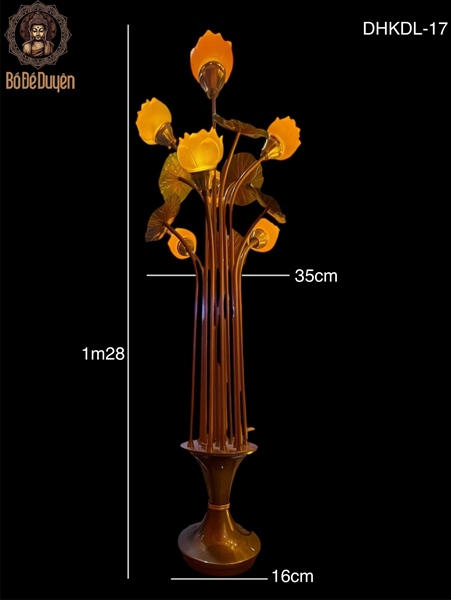 – Thiết kế: Dáng đèn đứng cao, bố cục hoa sen vươn cao thanh thoát, mang phong thái trang nghiêm
