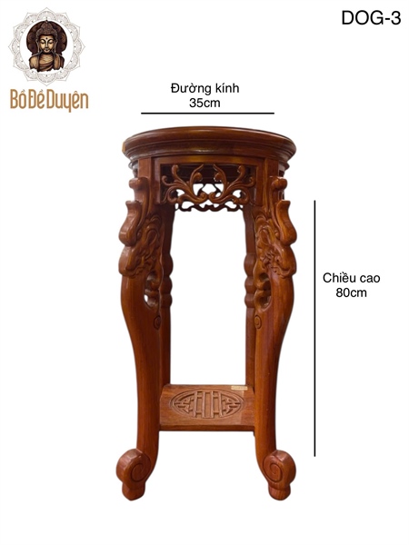 Đôn gỗ tròn được chế tác từ gỗ tự nhiên, dáng đứng cao, mặt tròn cân đối. Phần thân chạm khắc hoa văn cổ điển mềm mại, chân đôn vững chắc, tạo cảm giác trang nghiêm – ổn định – bền bỉ, phù hợp làm bệ tôn trí tượng Phật, Bồ Tát hoặc pháp khí lớn.