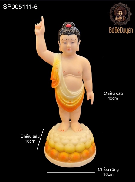 Tượng Phật Đản Sanh thể hiện khoảnh khắc Đức Phật thị hiện nơi đời, tay chỉ trời – tay chỉ đất, mang ý nghĩa khai mở trí tuệ, giác ngộ và tự soi chiếu chính mình. Hình tượng trang nghiêm, nét mặt hiền hòa, thần sắc an nhiên, phù hợp thờ tự và tôn trí trong các dịp lễ Phật Đản hoặc không gian thờ Phật tại gia.