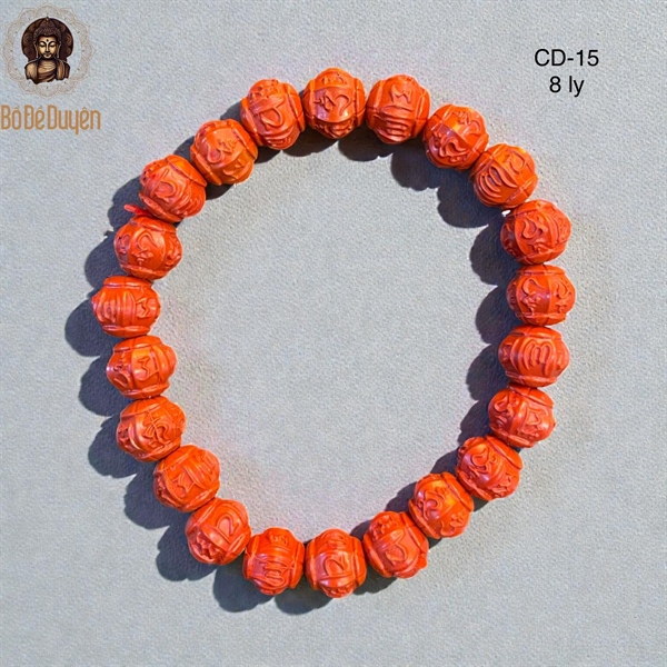Vòng tay đá chu sa 8 ly được chế tác từ hạt chu sa tròn, chạm khắc họa tiết tinh xảo, màu đỏ cam đặc trưng, bề mặt mịn và đều hạt. Thiết kế đơn giản nhưng trang nghiêm, phù hợp đeo hằng ngày, khi tụng kinh – niệm Phật hoặc làm quà tặng ý nghĩa cho người thân.