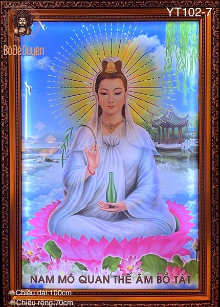 Tranh Quan Thế Âm Bồ Tát kích thước 70x100cm là dòng **tranh điện Phật giáo**, được dùng phổ biến trong không gian thờ tự. Hình tượng Đức Quan Thế Âm hiện thân cho **từ bi – cứu khổ – lắng nghe tiếng kêu của chúng sinh**, mang đến năng lượng an lành và che chở cho gia đạo.